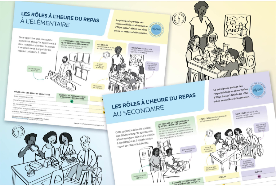 La confiance et le respect sont des aspects importants des repas et des collations à l’école, et ils forment la base du principe du partage des responsabilités en alimentation (partage des responsabilités)*. Élaborée par la diététiste Ellyn Satter, cette approche de l’alimentation, fondée sur des données scientifiques, a fait l’objet de recherches approfondies et est recommandée par des groupes tels que Les diététistes du Canada et les Services de santé de l’Alberta. Suivre le principe du partage des responsabilités aide les élèves à apprendre à manger toutes sortes d’aliments, ce qui représente un processus de longue durée, ainsi qu’à choisir leurs aliments.